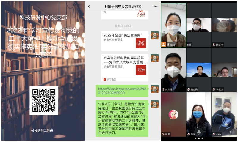 12月4日至8日,科技研發(fā)中心黨支部圍繞“學(xué)習(xí)貫徹黨的二十大精神,推動(dòng)全面貫徹實(shí)施憲法”主題,舉行了“憲法宣傳周”系列活動(dòng)。組織干部職工集中學(xué)習(xí)了《憲法》《民法典》《公司法》《安全生產(chǎn)法》《中華人民共和國反電信網(wǎng)絡(luò)詐騙法》和《中華人民共和國科學(xué)技術(shù)進(jìn)步法》等法律法規(guī)、開展憲法宣傳海報(bào)設(shè)計(jì)和憲法知識(shí)競答活動(dòng),督促引導(dǎo)廣大職工知法、學(xué)法、懂法、守法、用法,樹立憲法思維,筑牢法律防線,切實(shí)維護(hù)憲法權(quán)威,激發(fā)了廣大職工參與憲法學(xué)習(xí)的積極性和主動(dòng)性。