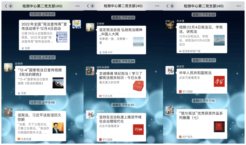 近日,檢測中心第二黨支部組織全體黨員干部職工圍繞“學(xué)習(xí)宣傳貫徹黨的二十大精神,推動(dòng)全面貫徹實(shí)施憲法”主題,利用微信學(xué)習(xí)群開展“日日我分享”活動(dòng),通過分享學(xué)習(xí)資料、撰寫學(xué)習(xí)心得體會(huì)、開展二十大精神學(xué)習(xí)、憲法知識(shí)測試以及參加“中國普法欄目”開展的“憲法宣傳周”有獎(jiǎng)競答活動(dòng)等方式,進(jìn)一步加深了對憲法知識(shí)的學(xué)習(xí)。