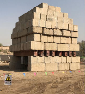 我院自成功中標黃河樓建設(shè)項目(一期)工程第三方工程質(zhì)量檢測項目后,院領(lǐng)導高度重視。與建設(shè)方多次溝通后,院領(lǐng)導便積極組織人員進行現(xiàn)場檢測任務(wù),協(xié)調(diào)將試驗用配重塊及鋼梁等設(shè)備分別從劉家峽、蘭州新區(qū)等地運至檢測現(xiàn)場。依據(jù)本次堆載依據(jù)設(shè)計資料,結(jié)合相關(guān)規(guī)范的要求,采用慢速維持荷載法對試驗樁進行單樁豎向承載力靜載荷試驗,單樁豎向抗壓極限承載力不小于7200kN,也就意味著堆載不得低于870T,這在甘肅省內(nèi)也是罕見的。