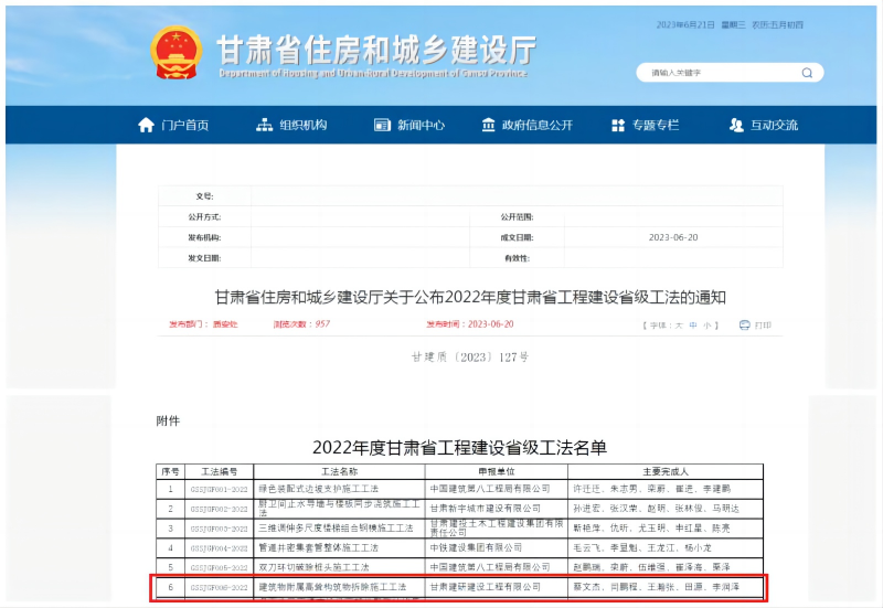近日,甘肅省住房和城鄉(xiāng)建設(shè)廳發(fā)布《關(guān)于公布2022年度甘肅省工程建設(shè)省級(jí)工法的通知》,建研建設(shè)公司申報(bào)的《建筑物附屬高聳構(gòu)筑物拆除施工工法》獲批2022年度甘肅省工程建設(shè)省級(jí)工法,也是公司獲批的第四項(xiàng)省級(jí)工法。
