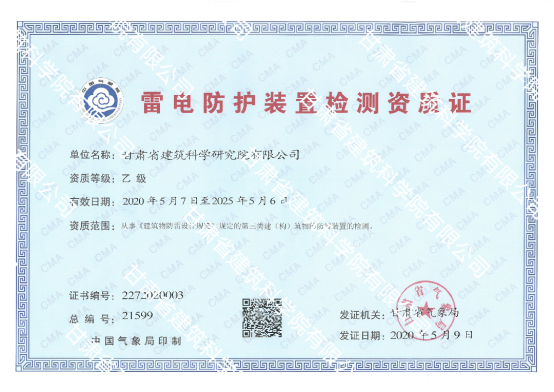 近日,經(jīng)甘肅省氣象局審查,甘肅省建筑科學(xué)研究院有限公司喜獲甘肅省氣象局頒發(fā)的《雷電防護(hù)裝置檢測(cè)資質(zhì)證書(shū)(乙級(jí))》。