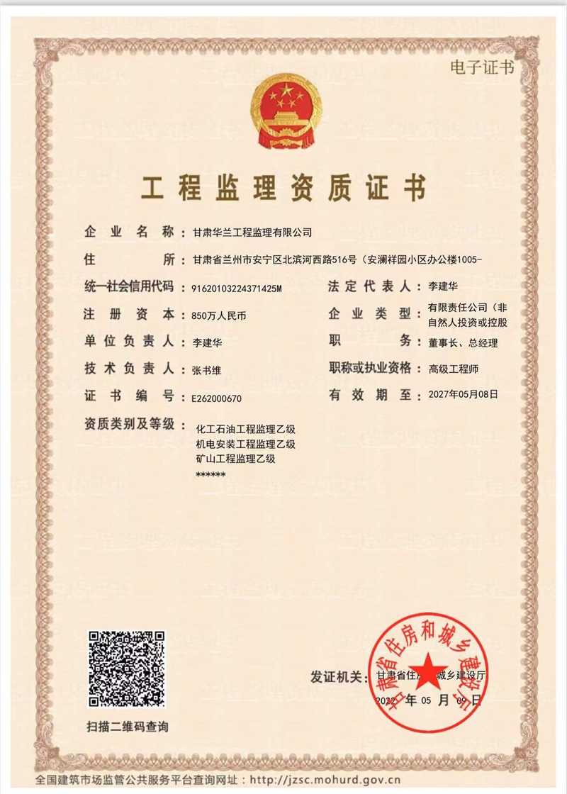 在建科院(集團(tuán))公司的大力支持下,甘肅華蘭工程監(jiān)理有限公司近日成功取得甘肅省住房和城鄉(xiāng)建設(shè)廳頒發(fā)的化工石油工程專業(yè)監(jiān)理乙級資質(zhì)。