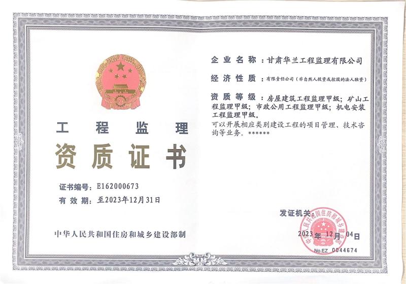 2023年是華蘭監(jiān)理公司成立三十周年,在甘肅建科院的大力支持下,甘肅華蘭工程監(jiān)理有限公司近日成功取得住房和城鄉(xiāng)建設(shè)部頒發(fā)的礦山工程監(jiān)理甲級資質(zhì)。