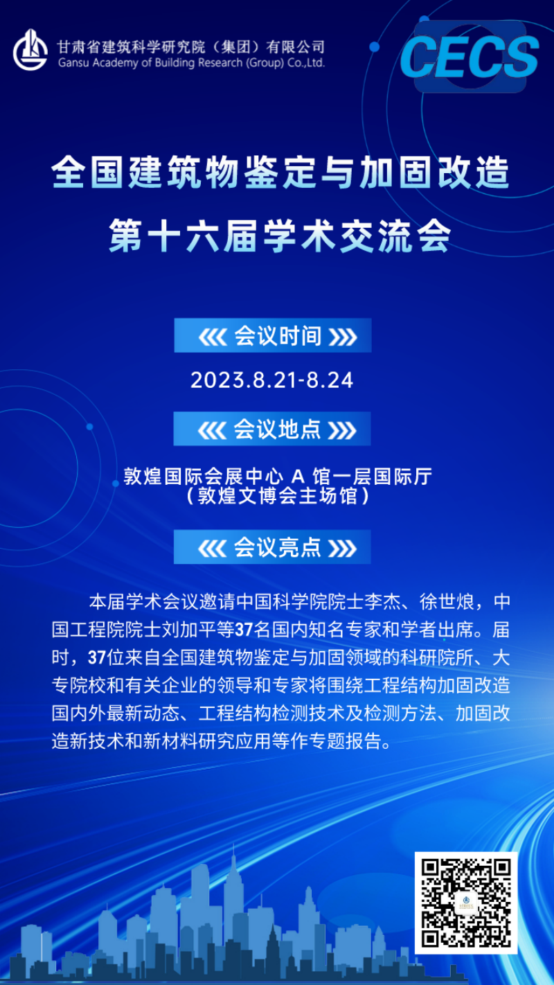全國建筑物鑒定與加固改造第十六屆學術交流會計劃于2023年8月21日-24日在甘肅敦煌舉行。會議由中國工程建設標準化協(xié)會建筑物鑒定與加固專業(yè)委員會主辦,甘肅省建筑科學研究院(集團)有限公司承辦。
