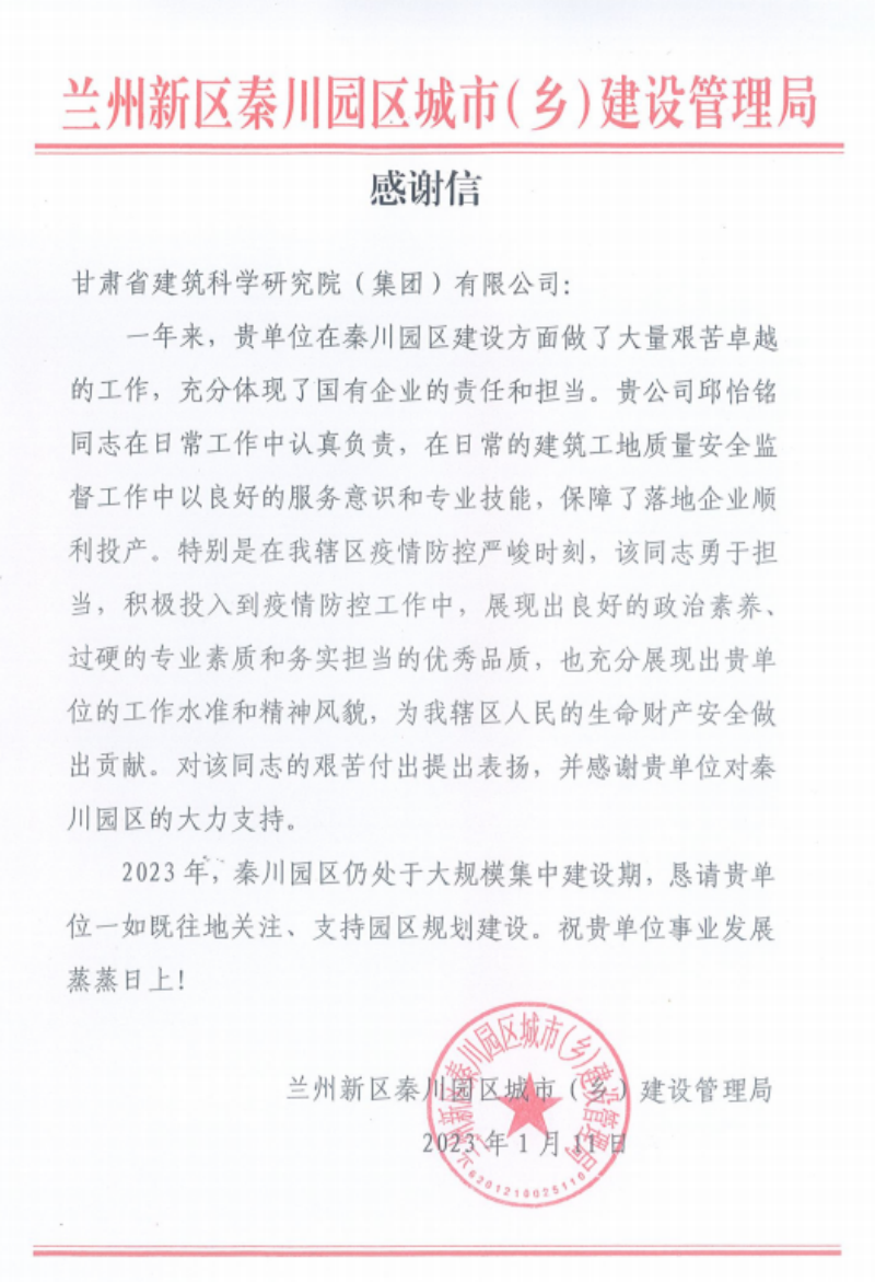 日前,建科院新區(qū)檢測中心收到了來自蘭州新區(qū)秦川園區(qū)城市(鄉(xiāng))建設(shè)管理局、西岔園區(qū)城市(鄉(xiāng))建設(shè)管理局的兩封感謝函,在對建科院的工作水準(zhǔn)和服務(wù)質(zhì)量做出充分肯定的同時(shí),感謝建科院對秦川園區(qū)和西岔園區(qū)建設(shè)的貢獻(xiàn)與支持,對建科院職工為當(dāng)?shù)刈龀龊玫呢暙I(xiàn)表示衷心感謝。