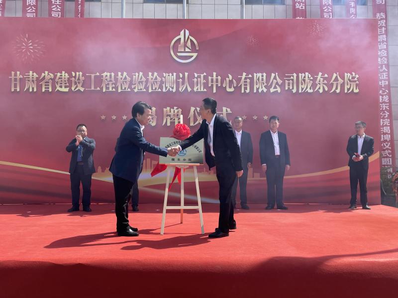 趙欣主持儀式;甘肅建科院總工程師王公勝致辭;隴東分院院長王振林作了表態(tài)發(fā)言;胥軍與張永志為甘肅省建設(shè)工程檢驗(yàn)檢測(cè)認(rèn)證中心有限公司隴東分院揭牌。